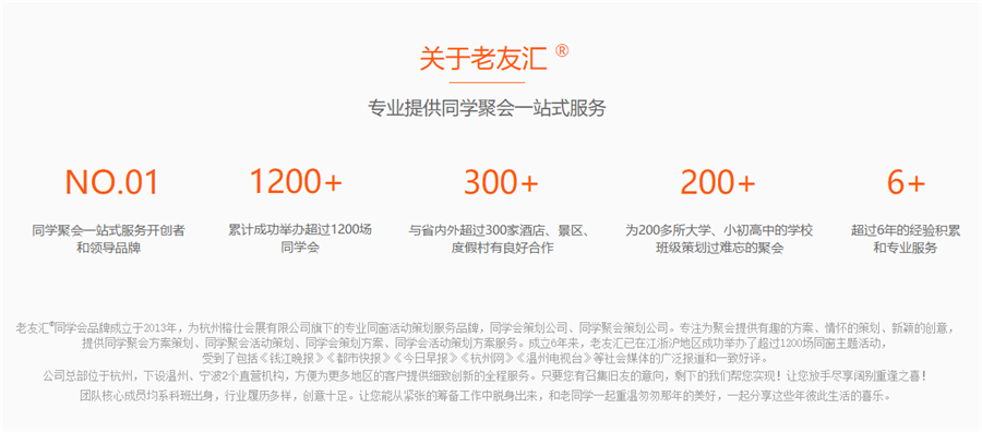 老友汇®同学会成立于2012年,为杭州榕仕会展有限公司旗下的专业同窗聚会活动策划服务品牌,专注为聚会提供有趣的方案、情怀的策划、新颖的创意,成立6年多以来,老友汇已在江浙沪地区成功举办了超过1200场同窗主题活动,受到了包括《钱江晚报》《都市快报》《今日早报》《杭州网》《温州电视台》等社会媒体的广泛报道和一致好评。